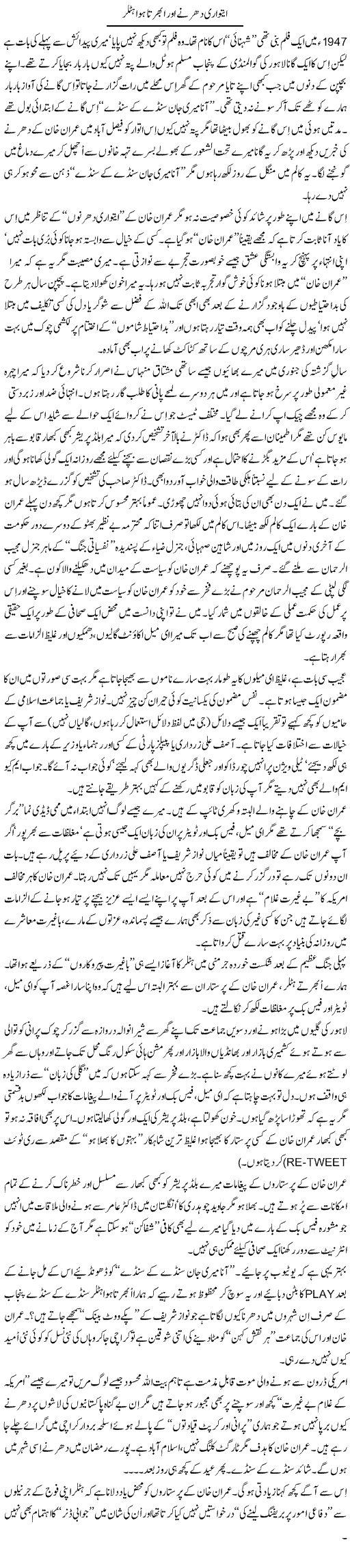 Imran Khan Kay Itwari Dharnay Aur Ubharta Hua hitler by Nusrat Javed 28 july 2011
